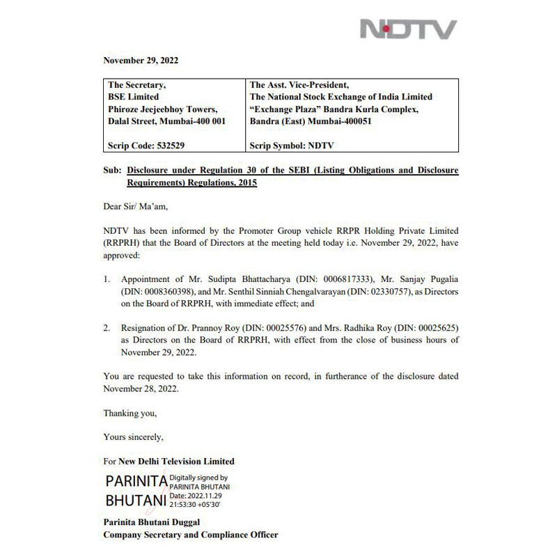 Mumbai: News broadcaster NDTV Ltd., in a regulatory filing on Tuesday, announced that the company’s owner and founders, Prannoy Roy & Radhika Roy, have stepped down...
