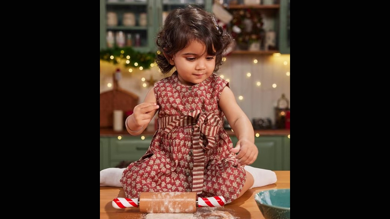 Fabindia’s festive charm extends to the little ones too. The Maroon Cotton Silk Hand-Block Printed Dress (Rs 1,687), with its flared silhouette, refined collar and striped waistband, promises a picture-perfect Christmas moment best styled with metallic sandals and a sweet hair accessory.