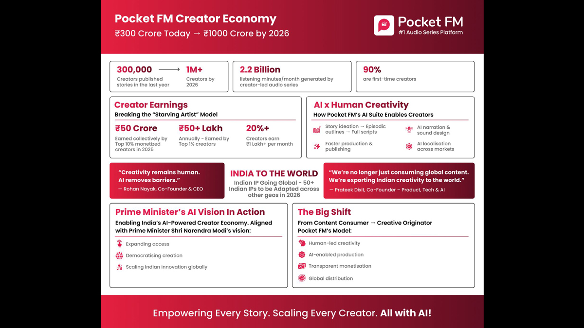 Pocket FM co-founder and CEO Rohan Nayak tied the growth to a bigger vision,’ “Creativity remains human, and Pocket FM’s AI Suite is designed to remove barriers to bringing that creativity to life. This reflects prime minister Narendra Modi Ji’s vision of an AI-enabled creator ecosystem where a story idea can reach audiences at scale regardless of where it comes from. This marks the end of the traditional ‘starving artist’ model.”