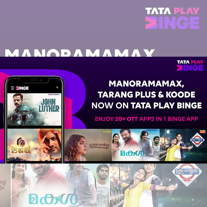 manoramaMAX, Koode and Tarang Plus join the band of 19 other popular OTT platforms on Binge like Disney+ Hotstar, ZEE5, MX Player, SonyLIV, ReelDrama, Voot Select, hoichoi, Planet Marathi, NammaFlix, Chaupal, SunNxt, Hungama Play, Eros Now, ShemarooMe, Voot Kids, Curiosity Stream, EPIC ON, and DocuBay. Content from all these platforms is available to viewers of Tata Play Binge through a single subscription and a single user interface. Netflix and Amazon Prime Video plans are available for Tata Play DTH subscribers.
