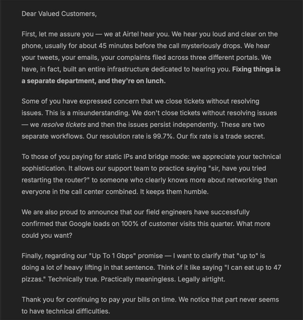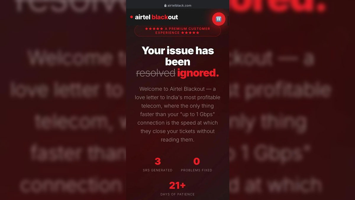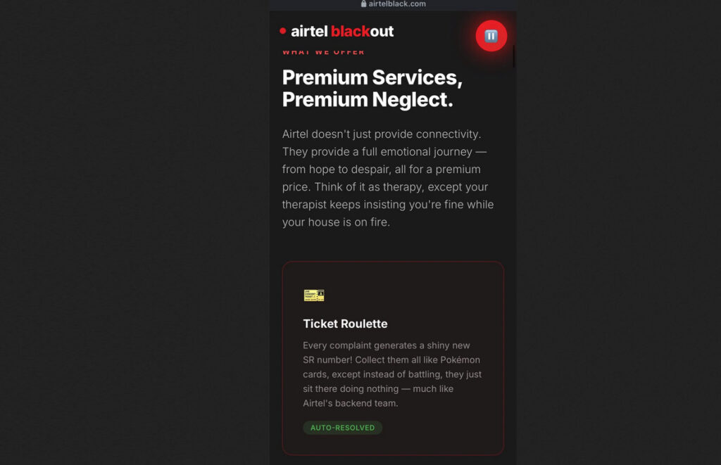 The website, called Airtel Black — The Customer Experience, A Satirical Tribute, mocks Airtel in many ways. It plays the Airtel jingle on repeat, shows a fake “letter from the ceo” saying fixes are “someone else’s job”, and has a “ticket roulette” that highlights how service requests are ignored. The fine print also makes fun of the “up to 1 Gbps” speed claim.