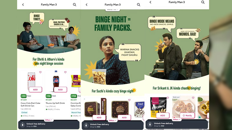 The centrepiece was a “mission binge” activation on Zepto, where, for the first time, the quick-commerce app opened its search bar to an external entertainment partner. Users typing “The Family Man” or “The Wanted Man” between 6pm and midnight were funnelled into a story-driven search journey ending in a curated list of “binge supplies needed for 6 hours”, nodding to the new season’s runtime. Character-led cues shaped the experience: Srikant’s spartan logic steered essential snacks, while JK’s appetite lent itself to indulgent momo picks tied to the show’s storyline.